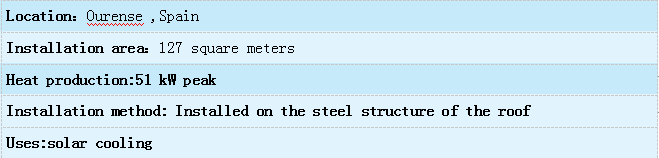 Due to the demand for refrigeration, hospitals and health departments constitute a large market for centralized solar energy. In the city of Ourense, Spain, our solar collectors supply the heat that drives the refrigerator. In addition to solar collectors, on-site biofuel burners also supply heat. These solar collectors were installed on the roof of the hospital and proved that the collectors can be installed in these dense areas
